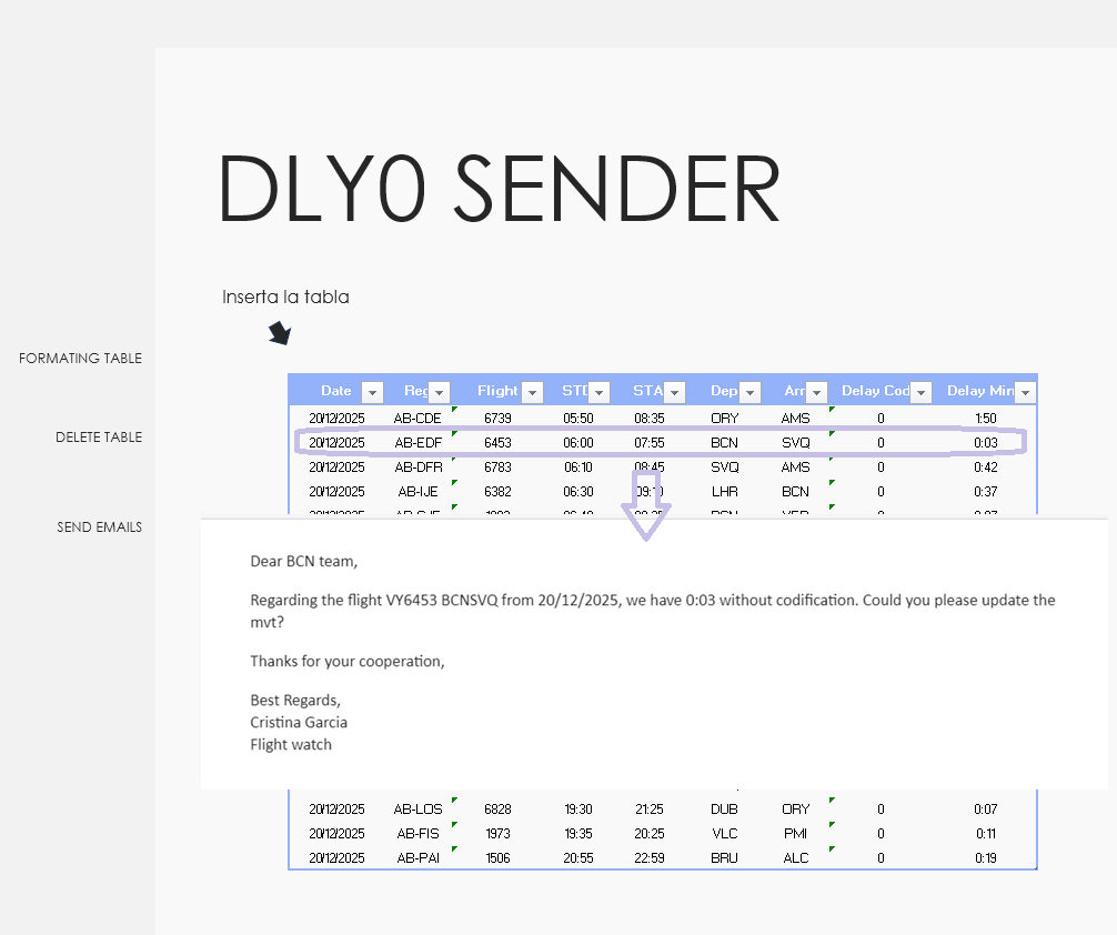 A continuación se muestra la tabla de vuelos con Delay Code 0 estandarizada y el proceso automatizado de generación y envío de correos a las bases correspondientes. Nota: los datos mostrados no son reales.
